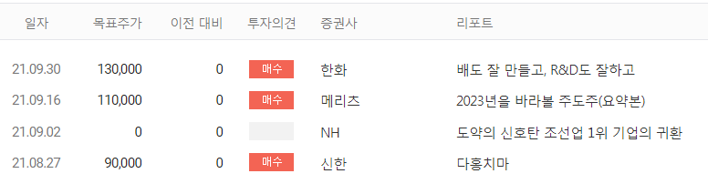 9월 30일 한화증권에서는 단기 조선업화 호조와 LNG선박 등 대형 선박 발주 증가는 동사에도 긍정적이고 암모니아로 전환하는 과정인 R&D도 잘한다고 하였다.