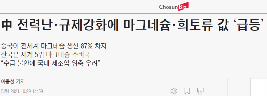 1. 중국 당국이 전력난 속에서 대표적 에너지 소모 산업이자 탄소 배출 산업인 마그네슘 제련소 운영을 제한하여 희토류 가격이 급상승하고 있다.