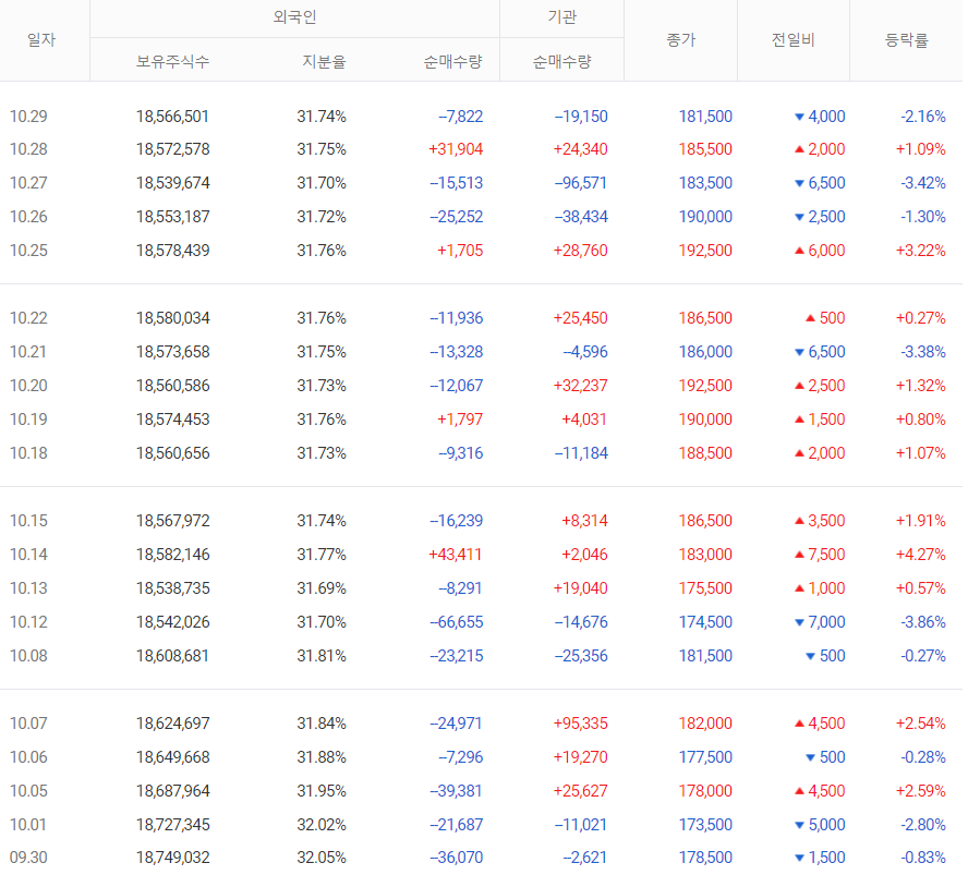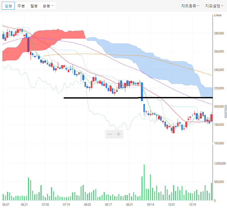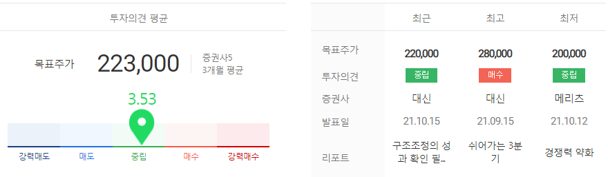 ⓑ 11월 1일 메리츠증권 리포트에서 투자의견은 중립이고 적정주가는 20만 원으로 실적을 기대하기 어렵다고 하였다.