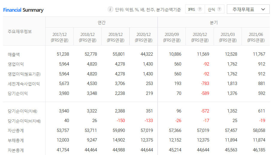 ㄴ) COVID-19의 타격을 입은 전년 동기 대비 매출의 증가, 판관비의 개선을 바탕으로 영업이익은 대폭 증가하였다.
