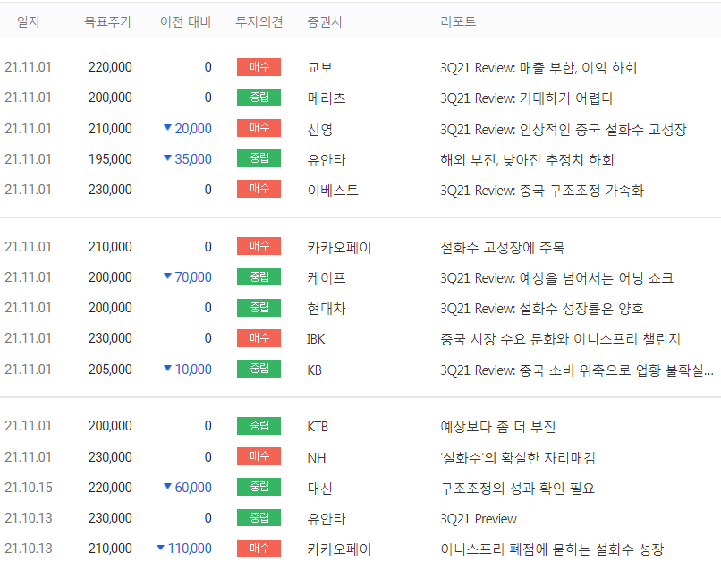 ⓒ 11월 1일 신영증권 리포트에서 투자의견은 매수이고 중국 설화수가 고성장하여 어느 때보다 의미 있는 성과가 나올 것이라고 하였다.