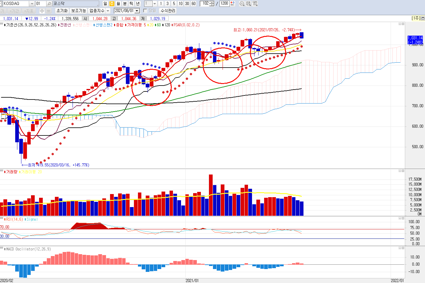 a) 20일선을 뚫고 내려오면 다시 올라갔다. 5일선은 깨졌다. 과연 8월에는 어떤 방향을 보여 줄 것인가?