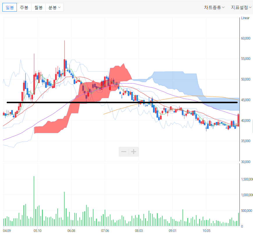 ㄱ) 일봉 차트에서 45,000원 이상에서 전고점 부분의 매물이 출회될 가능성이 있으니 주의하자.