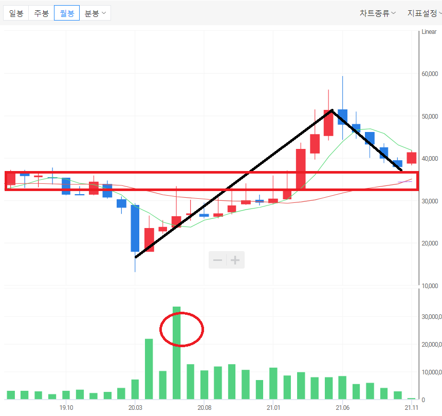 ㄴ) 월봉 차트에서 2020년 3월부터 상승 후 조정을 거쳤다가 다시 상승하려고 하고 있다. 2019년 상장 후 만들어 놓은 매물대가 지지가 되어 주고 있다.