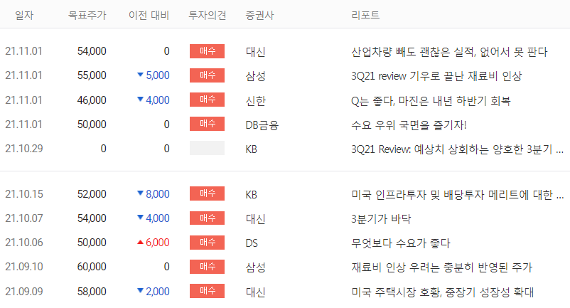ⓒ 11월 1일 신한증권에서 목표주가 46,000원 투자의견 매수이며, 마진은 내년 하반기에 회복될 것이라고 전망하였다.