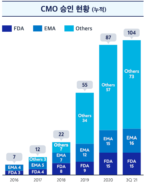 4 공장은 2020년 11월에 착공해서 2022년 하반기에 부분 가동이 되고 2023년 하반기에는 완공을 목표로 하고 있다. 바이오와 제약이 고성장하고 있고 CMO 수요가 증가함에 따라서 완공 전에 선수주 활동이 진행되고 있다. 4 공장이 원활하게 가동된다면 실적의 증가에는 의심할 여지가 없다.