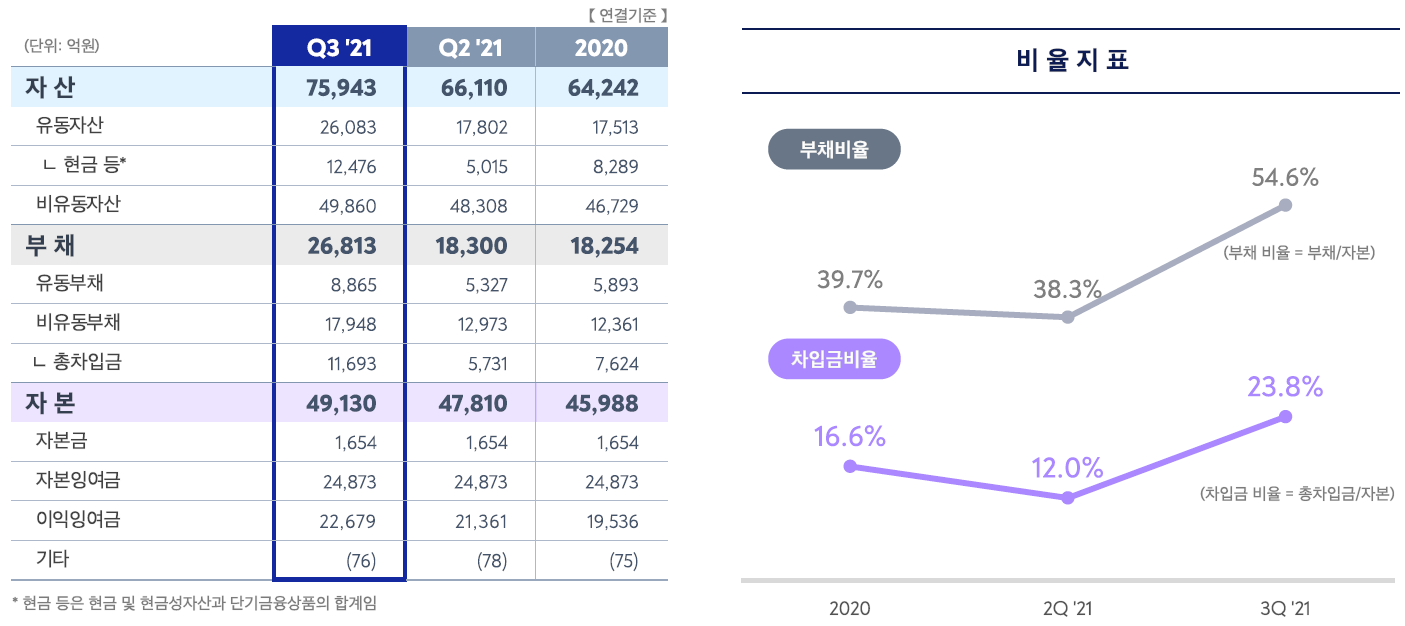 ⓐ 차입금 증가로 인해 부채비율 54.6%, 차입금 비율 23.8%로 증가하였으나, 안정적인 재무 상태를 유지하고 있다.