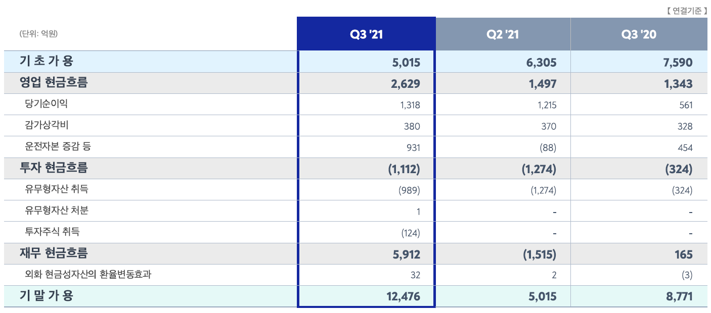 ⓐ 실적 개선에 따른 영업현금흐름 증가 및 회사채 발행으로 기말 가용 현금 12,476억 원을 기록하고 있다.