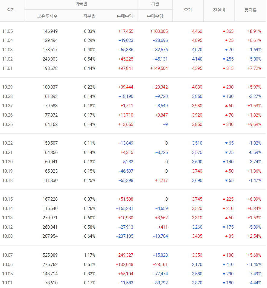 ㄱ) 10월 1일부터 개인은 0.8억 원 매도, 외국인 2.28억 원 매수, 기관 0.8억 원 매수하고 있다.
