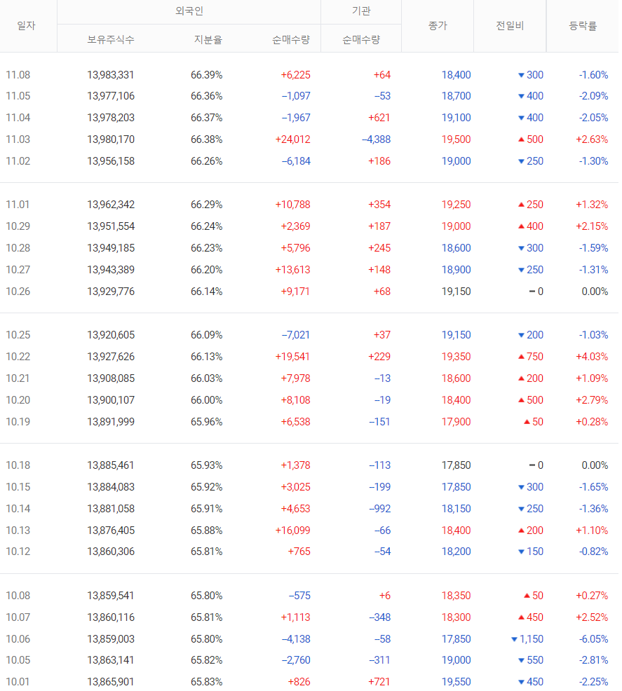 ㄱ) 10월 1일부터 현재까지 개인 17.8억 원 매도, 외국인 19.9억 원 매수, 기관 0.6억 원 매도하고 있다.