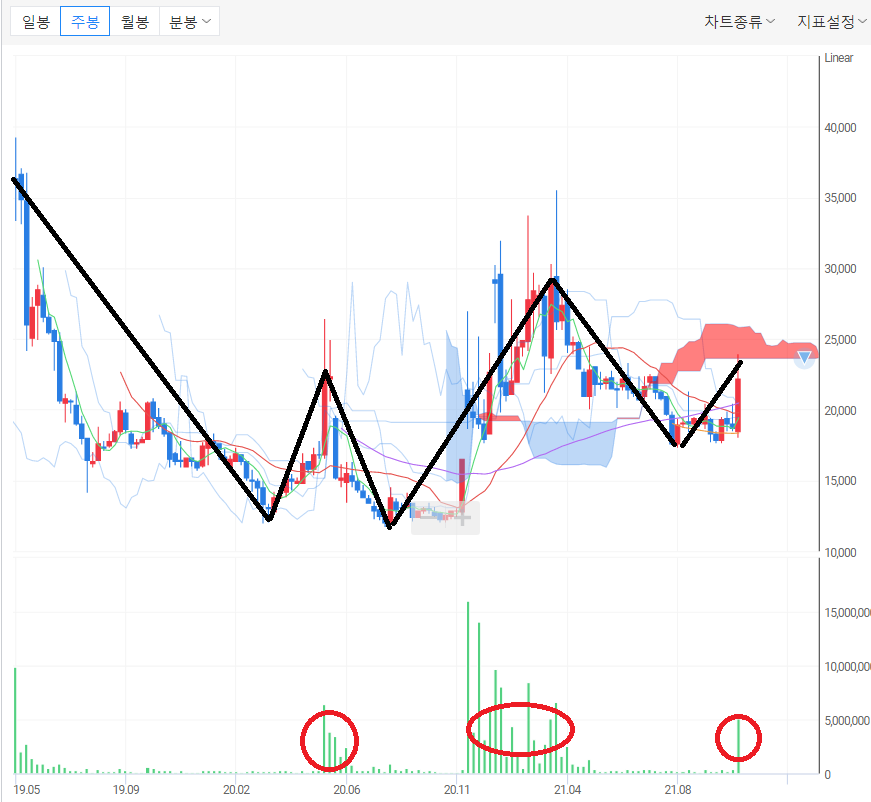 SNK는 사우디 왕세자가 인수한 코스닥 상장 게임 기업으로 외국인 주식 소유 비율이 66.39%인 만큼 수급도 외국인이 주요 세력이다. SNK의 공모가는 40,400원으로 상장한 당시부터 계속 하락하다가 2회의 반등이 나왔고 다시 상승하는 구간이다. 약 3만 원 부근에는 매물대가 많이 있으니 주의하기 바란다. 만약에 3만 원을 뚫고 상승한다면 큰 수익도 기대해 볼 수 있다고 생각한다.