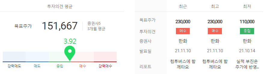 ⓑ 11월 11일 신한증권에서는 목표주가 22만 원, 투자의견 매수를 제시하였으며 예상보다 빠른 NFT활용 게임을 출시하고 메타버스 플랫폼에 주목하자고 하였다.