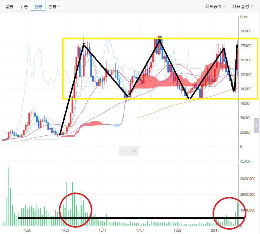실적이나 수급은 그냥 그렇다. 월봉 차트에서도 박스권 상단으로 보인다. 박스권 상단을 돌파할 수도 있지만 전고점들의 매물벽들은 만만하지 않아 보인다. 갑자기 찬양적인 증권사의 리포트들 또한 매수를 경계하게 만든다. 추격매수나 돌파매매 그리고 뇌동매매는 하지 않아야 하며 만약에 매수한다면 손절 가격을 정하는 것이 좋을 듯싶다.