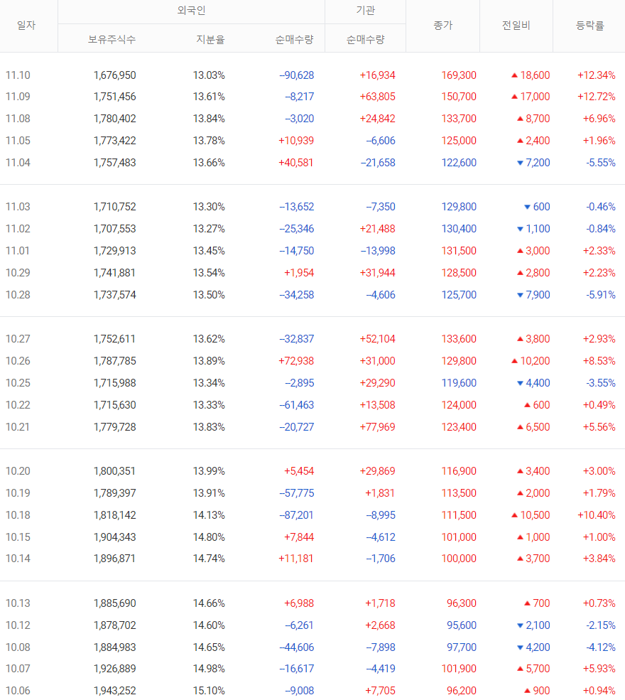 ㄱ) 10월 1일부터 현재까지 개인 219.4억 원 매도, 외국인 536.7억 원 매도, 기관 678억 원 매수하고 있다.