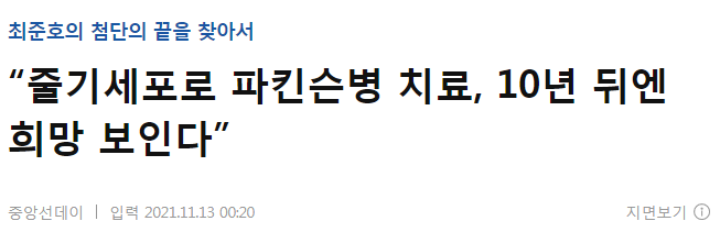 줄기세포로 난치병 치료의 희망이 보인다. 줄기세포로 재생의료 기술에 대한 치료가 본격화되고 있다. 글로벌 시장이 연평균 10% 이상의 성장을 전망하고 있으며 정부에서도 첨단 재생의료 분야에 매년 1,000억 원을 투자하고 있다.