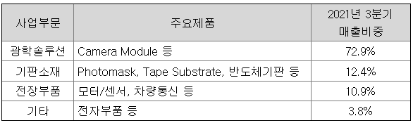 ㅁ) 연결회사는 광학솔루션, 기판소재, 전장부품 사업부문의 총 3개 사업부 체제로 운영되고 있다. 사업 포트폴리오 관리 강화 목적으로 전자부품 사업을 별도 사업 담당체제로 운영하고 있다.