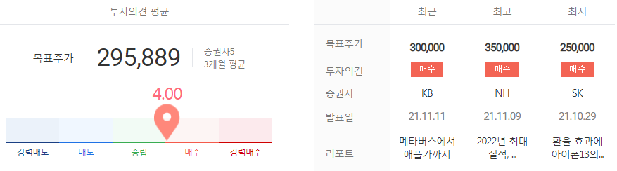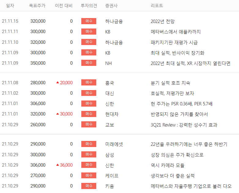 ⓑ 11월 11일 KB증권에서는 목표주가 30만원, 투자의견은 매수이며, P/E 6배로서 전기전자 업종 최선호주이며 메타버스 시장 개화의 최대 수혜주로 분류하였다. 또한 애플카 공급망 진입 역량을 충분히 확보하였다고 보고 있다.