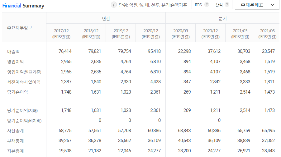 ㄱ) 2021년 3분기 매출액 3.8조원, 영업이익 3,357억원, 당기순이익 2,271억원으로 전년 동기 대비 각각 71.36%, 209.78%, 743.90% 증가하였다.