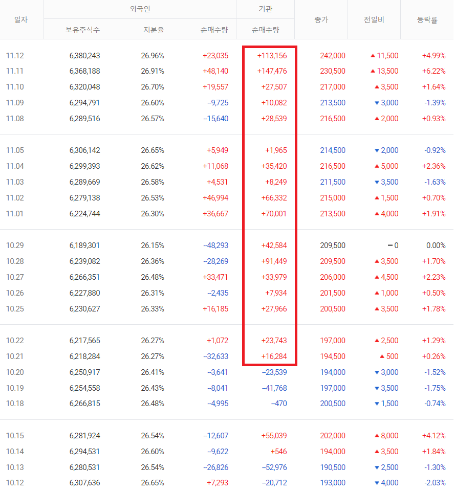 ㄷ) 11월 15일 오늘은 개인 126.4억원 매도, 외국인 115.5억원 매도, 기관 251.0억원 매수이다.