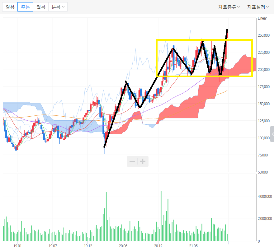 ㄴ) 주봉차트에서 약 10개월 동안 박스권을 만들다가 일목균형표의 양운층을 지지하며 상승하고 있다.