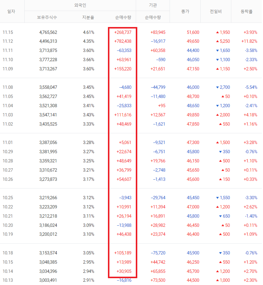 외국인의 수급이 돋보이며 실적도 좋다. 차트에서도 다중 바닥을 만들고 거래량이 늘어나며 우상향하고 있다. 5.5만 원의 저항을 뚫으면 상단은 열려있다고 보인다.
