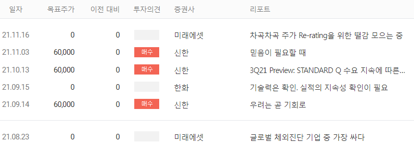 ⓑ 11월 3일 신한증권에서는 목표주가 6만 원, 투자의견 매수를 제시하였으며, 선제적 투자로 포스트 코로나를 대비하고 M&A를 통한 성장 스토리가 향후 주가의 방향을 결정할 전망이라고 하였다.