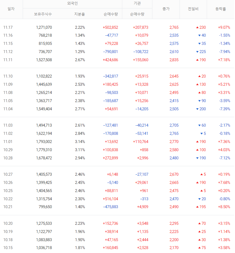 ㄷ) 개인은 매도 중이고 외국인과 기관이 매수하고 있다.
