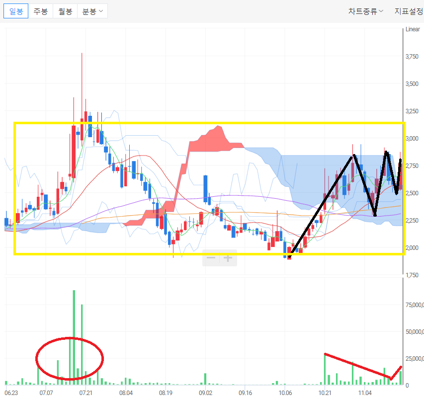 ㄱ) 일봉 차트에서 2 ~ 3천 원 부근에서 박스권으로 움직이고 있다. 일목균형표의 음운층에서 위, 아래로 움직이다가 위로 방향을 잡은 모습을 하고 있다.