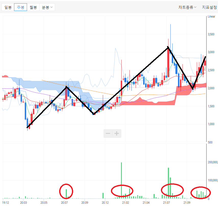 ㄴ) 주봉 차트에서 보면 지금은 상승 5파가 시작되는 지점으로 보인다.