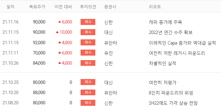 ⓑ 11월 15일 대신증권에서는 목표주가 9만 원, 투자의견 매수이며, 2021년 3분기 파운드리 가격 상승으로 추정치를 상회하였으며 2022년 연간 수주도 확보하였다고 전망했다.