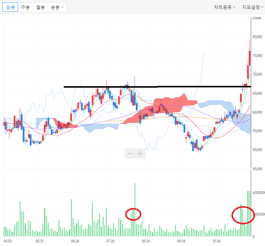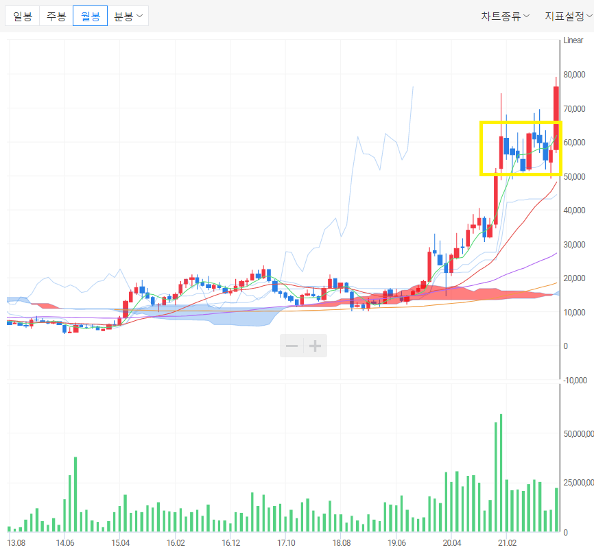 ㄴ) 월봉 차트에서 박스권 부근인 5 ~ 6.7만 원을 돌파하고 있다. 추가 상승하기 위해서는 거래량의 증가가 필요하다.