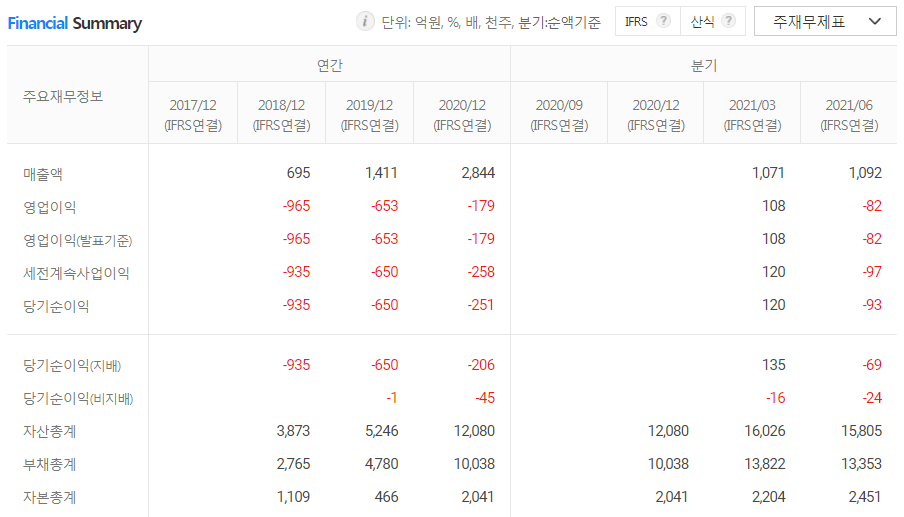 2021년 3분기 매출액은 약 1,100억 원 정도이고 영업이익과 당기순익이 각각 10억, 19억 손실로 적자인 기업이다. 이렇게 허접한 실적이 시가총액 28조나 된다는 것은 솔직히 말이 안 된다고 본다.