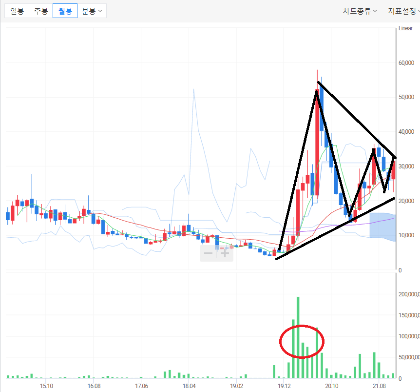 ㄴ) 월봉 차트에서 작년에 약 7개월 동안 대시세를 만들고 난 후에 삼각형 모양의 형태로 위, 아래를 반복하고 있다.
