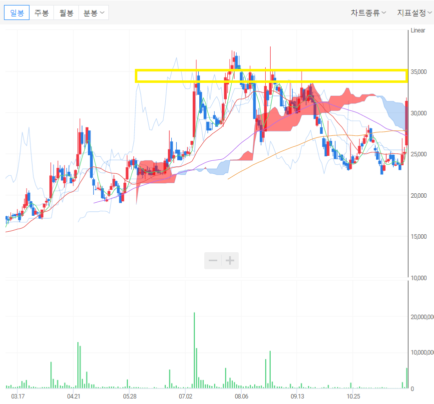 ㄱ) 일봉 차트에서 일목균형표의 음운층을 돌파하는 모습을 보여주고 있다. 단기 매물대는 약 3.5만 원 부근이다.