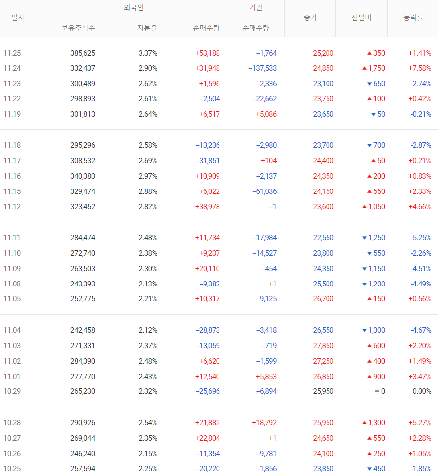 ㄴ) 11월 26일 오늘은 개인 13.4억 원 매도, 외국인 17.8억 원 매도, 기관 28.2억 원 매수하였다. 기관 중에서 연기금이 62.8억 원 매수하였다.
