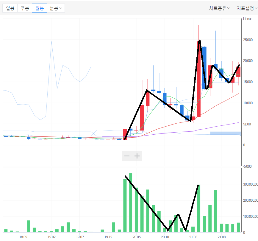 ㄴ) 월봉 차트에서 상승할 때는 대량의 거래량을 동반해서 급등한 후에는 윗꼬리가 달린 봉이 만들어진다. 20월선이 저항이 되어서 20월선까지 내려오면 다시 상승하고 있다.