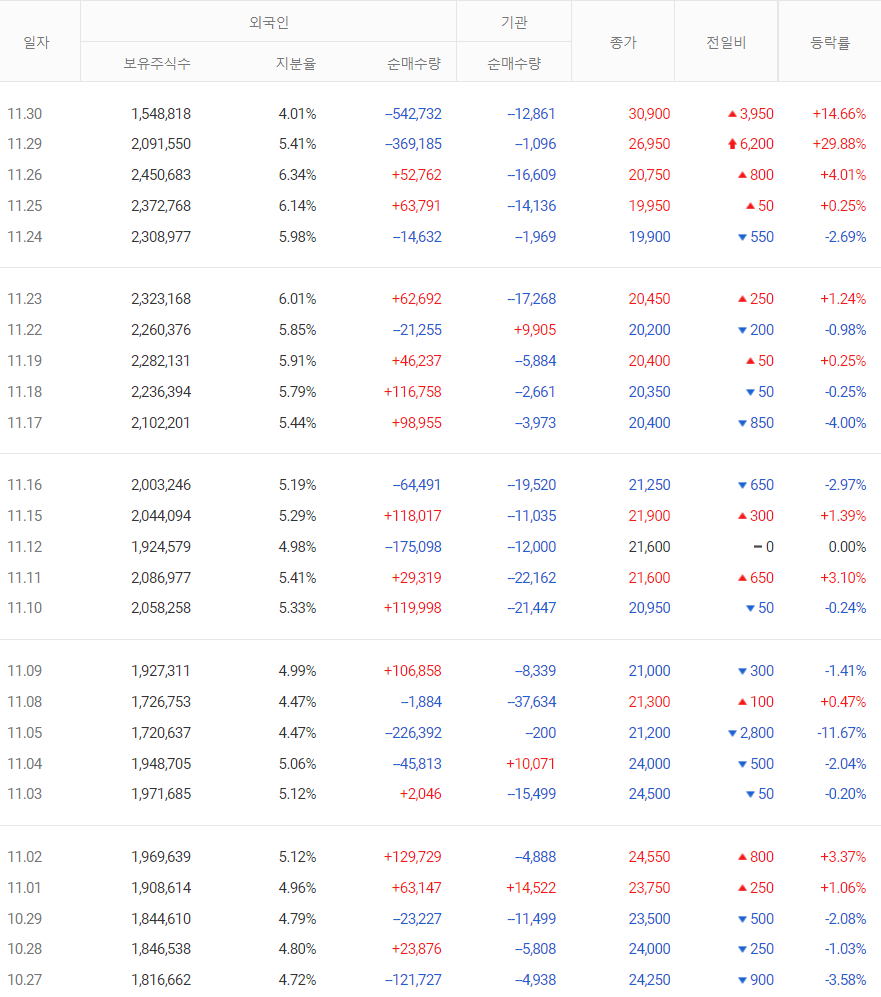 ㄴ) 11월 30일 수급은 개인 160.5억 원 매수, 외국인 165.4억 원 매도, 기관 3.4억 원 매도하였다.