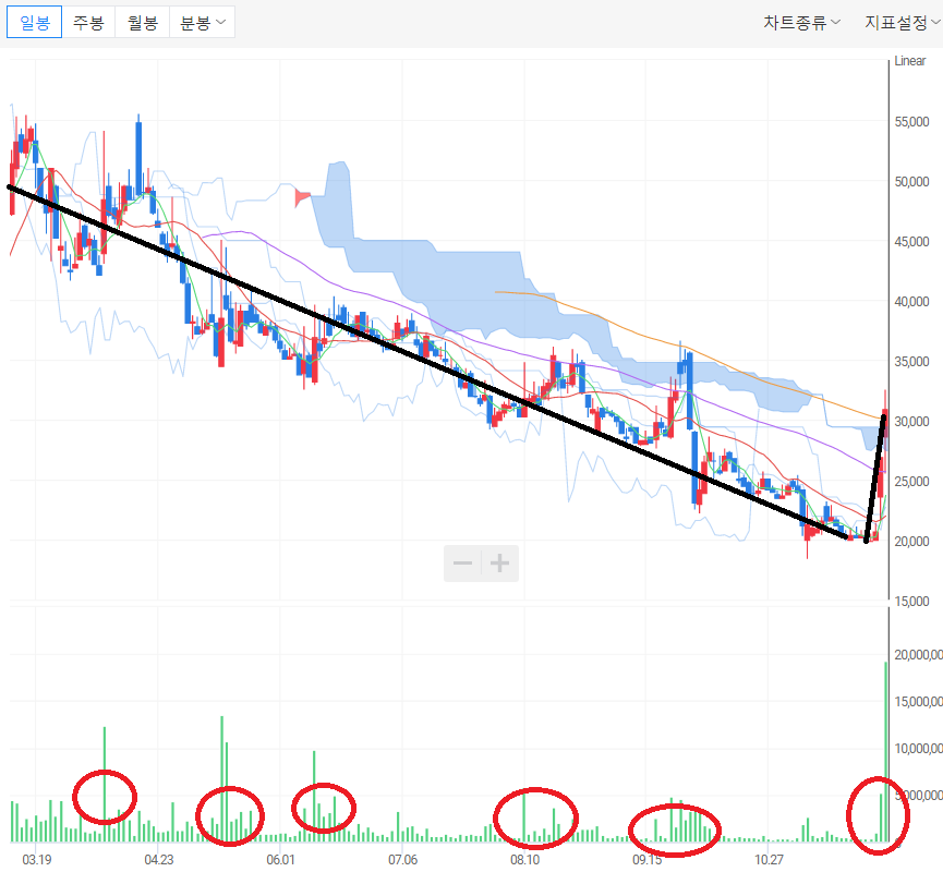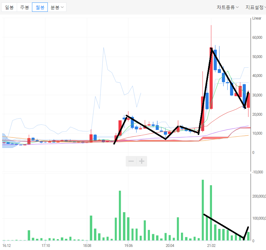 ㄴ) 월봉 차트에서 거래량이 증가하면서 상승의 흐름을 보여주고 있지만 위에 매물벽들이 많이 있어 보인다.