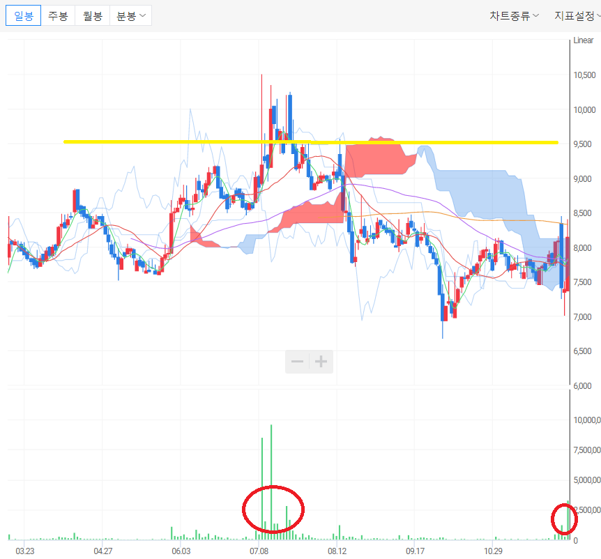 ㄱ) 일봉 차트에서 최근의 하락 흐름을 돌려세우는 장대 양봉이 거래량을 실으면서 나왔다. 약 9.5천 원 부근 위에서는 매물대가 많이 있는 것으로 보인다.