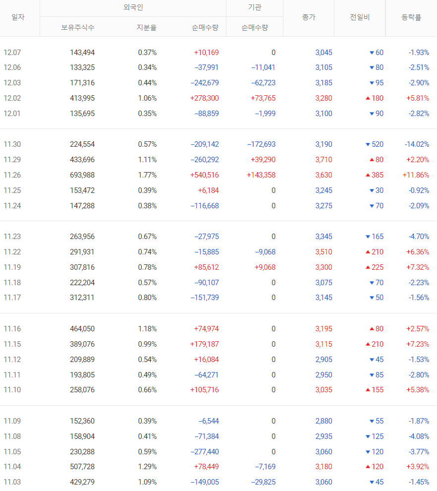 ㄱ) 11월 1일부터 현재까지 개인 2.7억 원 매도, 외국인 4.6억 원 매수, 기관 0.08억 원 매도 중이다.