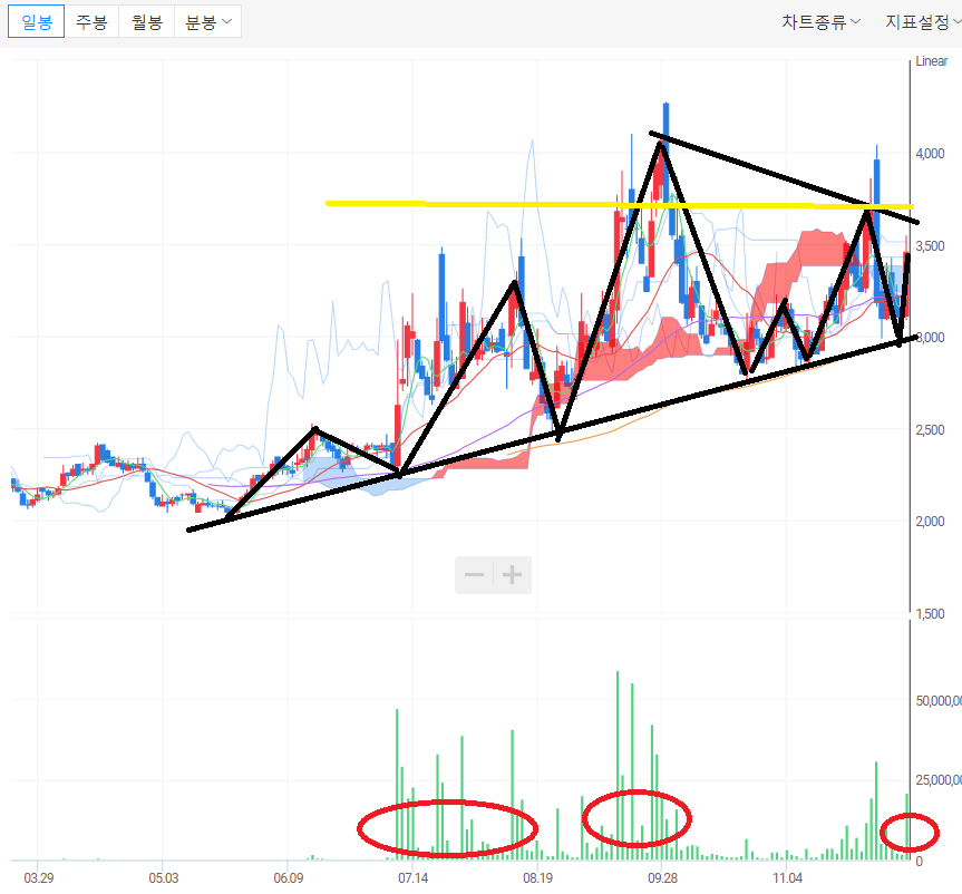차트에서는 깃발 모양의 형태로 주가의 등락이 반복되고 있다. 오늘은 양봉의 흐름이 나왔지만 상단의 추세를 뚫을 수 있을지 귀추가 주목된다. 저항구간은 약 3,750원 부근이다.