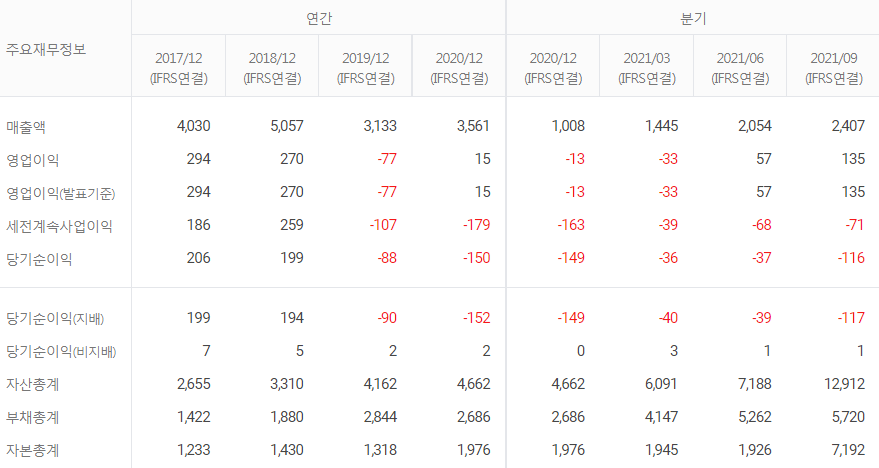ㄱ) 2021년 9월 전년 동기 대비 연결기준 매출액은 131.3% 증가, 영업이익은 484.9% 증가, 당기순손실은 6147.6% 증가하였다.