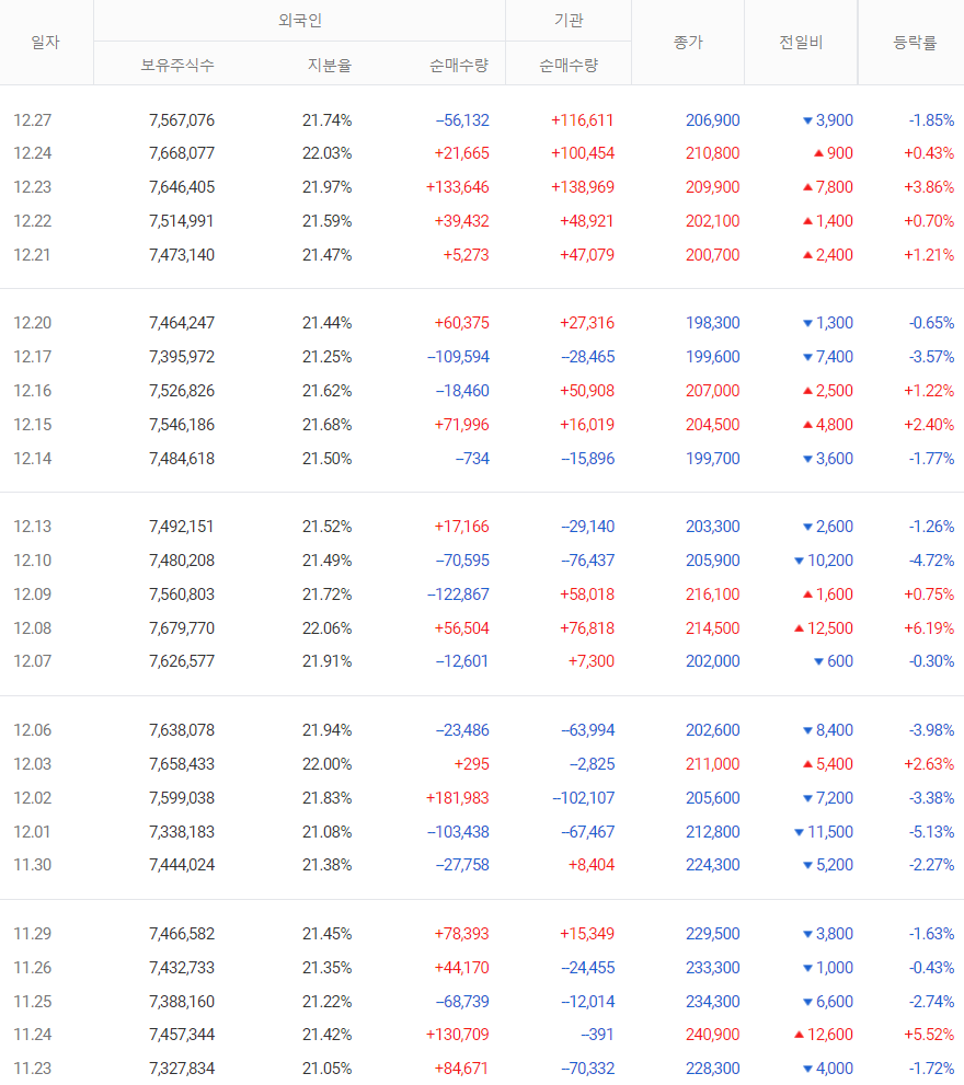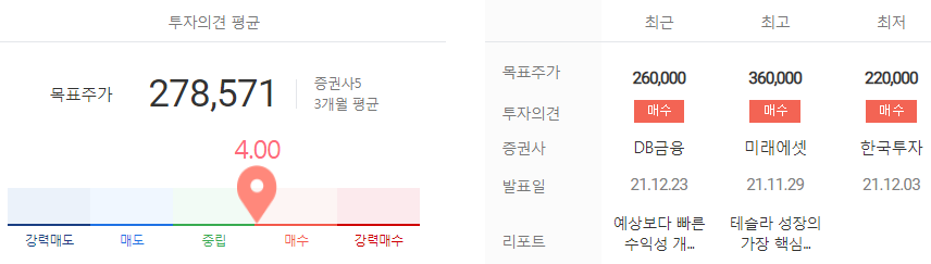 ⓐ 12월 23일 DB금융투자증권은 목표주가 260,000원, 투자의견 매수를 제시하였으며, 2021년 4분기에서의 수익성 개선세는 더욱 뚜렷해질 것이라고 전망하였다.