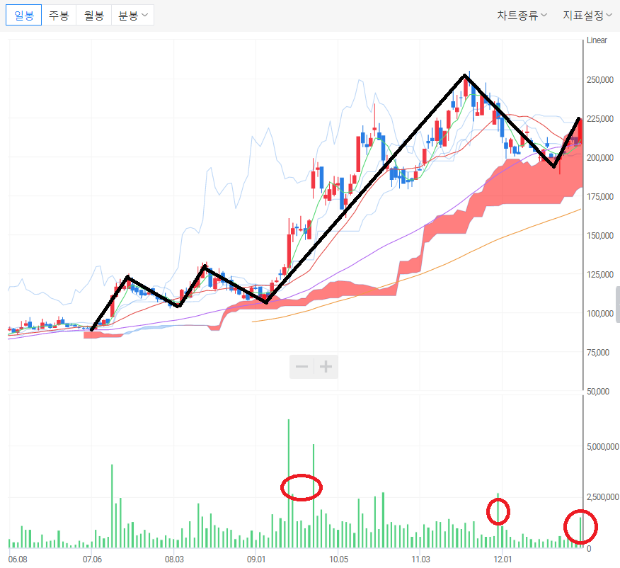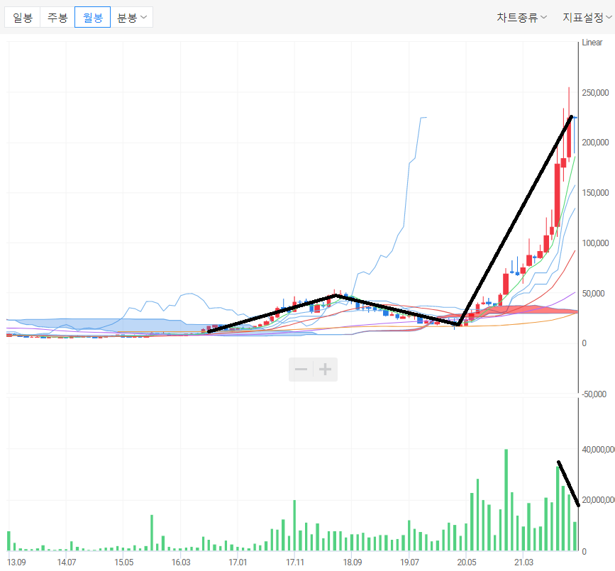 ㄴ) 월봉 차트에서 2020년 3월 12,656원에서 2021년 11월 224,300원까지 약 18배가 상승하였다. 거래량은 9월 이후에 감소하고 있다.
