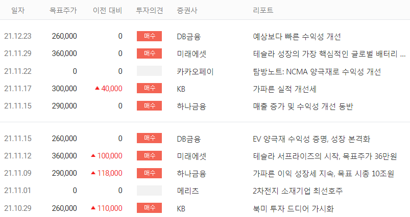 ⓑ 11월 29일 미래에셋 투자증권에서는 목표주가 360,000원, 투자의견 매수를 제시하였으며, 2024년부터의 생산능력, 매출액은 진행 중이고 고객사들과의 협의에 따라 추가 상향 조정이 가능하다고 하였다.