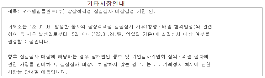 임플란트 및 치과치료에서의 선두 분야 기업인 오스템임플란트가 횡령, 배임 혐의 발생으로 인한 상장 적격성 실질 심사가 1월 24일까지 진행되며, 이 기간동에는 거래소에서 오스템임플란트의 매매가 중단된다. 상장 적격성 실질심사는 회사의 상장 유지에 문제가 있는지를 종합적으로 심사하는 과정으로서 심사 결과에 따라서 거래 재개 또는 상장폐지, 개선 기간 부여 등으로 나뉘게 된다.