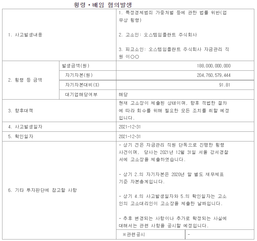 오스템임플란트는 특정경제범죄 가중처벌 등에 관한 법률 위반인 업무상 횡령으로 자금관리 직원인 이 모씨를 고소한 상태이다. 발생금액은 1,880억 원이며, 이는 자기 자본의 91.81%가 된다. 업계에서는 상장 폐지 가능성은 낮을 것으로 판단되지만 대규모 자금의 횡령이어서 자금 회수 가능성에 따라 실질 심사 여부가 결정될 것으로 보인다라고 예상했다.