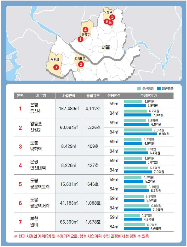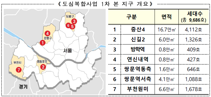 국토교통부는 3080+ 주택공급방안에 따라 선도 후보지로 추진 중인 증산 4, 신길 2, 방학역, 연신내역, 쌍문역 동측, 쌍문역 서측, 부천 원미 등 7곳을 오는 12월 31일(금)에 도심 공공주택 복합사업 본 지구로 지정한다고 밝혔다. 3080+ 주택공급방안의 핵심사업인 도심 복합사업의 첫 번째 본 지구 지정을 통해 약 1만 호 규모의 도심 내 주택공급이 확정됨에 따라 시장 안정 효과가 클 것으로 예상된다. 주택 가격이 올라감에 따라서 정부에서는 주택 공급을 늘리는 정책을 펼치려고 하는 것 같다.
