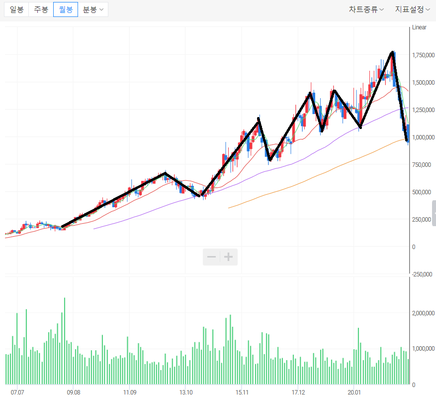 ㄴ) 월봉 차트에서 상승할 때는 천천히 상승하였지만, 하락할 때는 약 7개월 동안 연속 음봉을 기록하며 120월선까지 내려왔다.