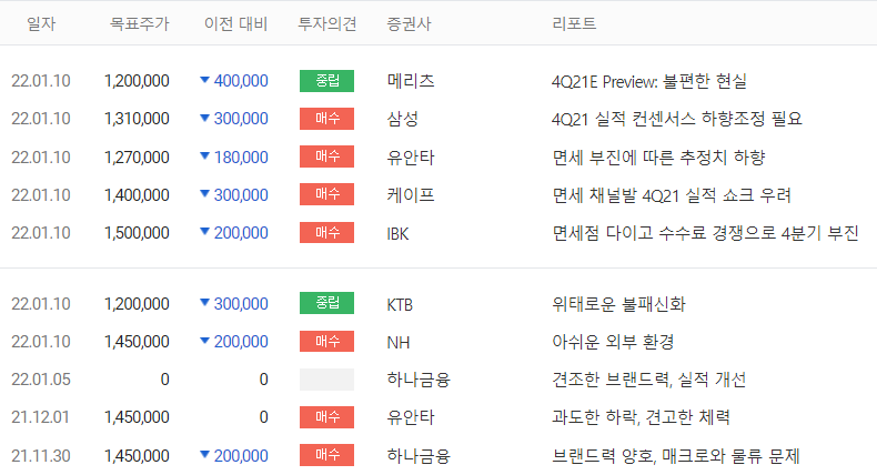 ⓒ 1월 10일 유안타증권에서는 목표주가 1,270,000원 투자의견 매수를 제시하였으며, 2021년 4분기 면세 부진에 따른 추정치는 하향할 것이며, 2022년 영업이익 1.3조 원(전년 대비 +3%) 증가를 전망하였다.